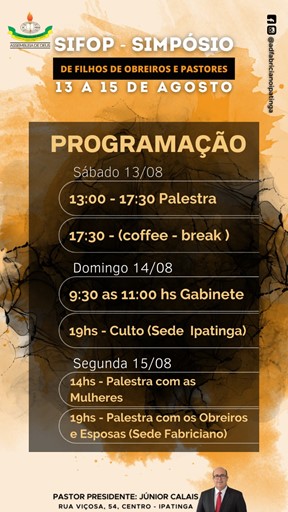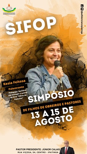 Assembleia de Deus ministério Coronel Fabriciano Ipatinga, realizou no sábado (13), no templo central em Ipatinga Rua Viçosa 54, 1º SIFOP – (SIMPÓSIO DE FILHOS DE OBREIROS E PASTORES) Sob o tema: “Filhos de pastores e obreiros” a palestrantes é filha de pastor, pedagoga, bacharel em teologia e autora do livro “Filhos de pastores”, Kesia Feitosa.