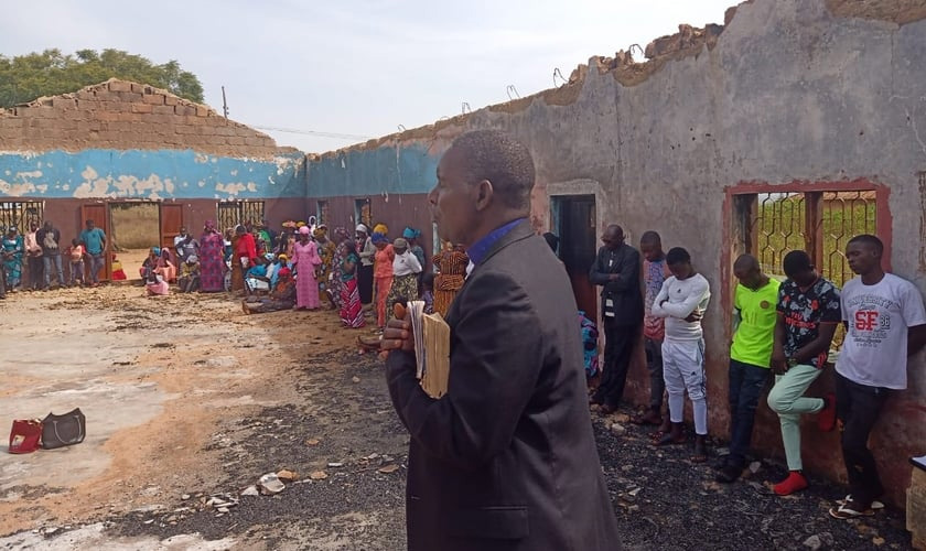 Culto na igreja queimada por militares Fulani. (Foto: Reprodução/International Christian Concern)