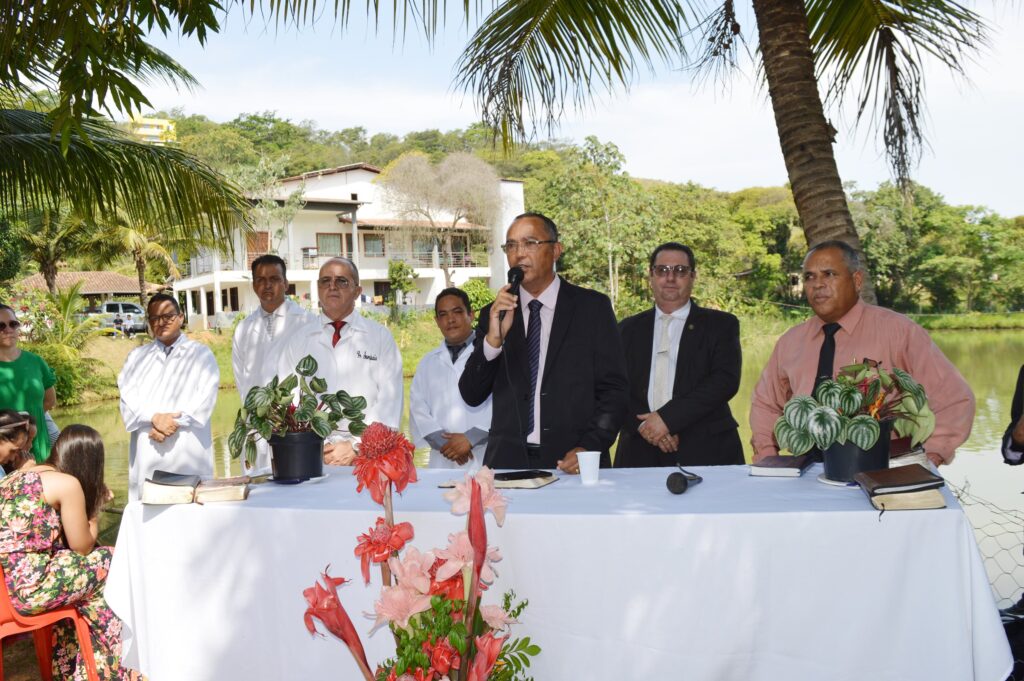 O pastor José Maria Ferreira, representando a Assembleia de Deus do Bairro Águas Claras em Santana do Paraíso, abriu o evento com louvores entoados pelos irmãos e pelo conjunto, acompanhados por hinos alusivos ao batismo.