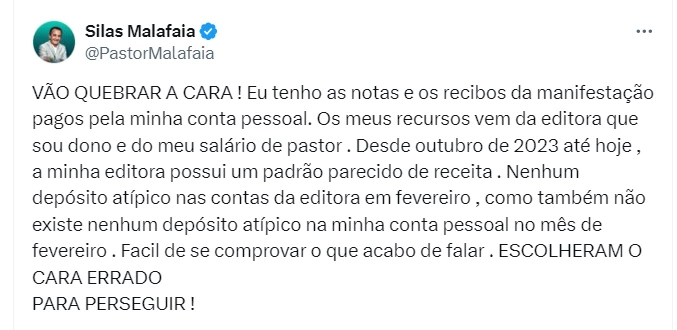 – Acabo aqui de sair do culto da minha igreja, em São Paulo, dia 26, segunda-feira, quando eu abro o celular e tô vendo: ah, a Polícia Federal vai intimar (…). Quanto é que foi gasto na manifestação do dia 25? Gente, começou a perseguição contra mim? Mais do que nunca, o que eu falei lá é a verdade. O Estado Democrático de Direito está em perigo. (…) Que vergonha! (…) Escolheram o cara errado. (…) Eu tenho nota de tudo. (…) Eu posso pagar outras manifestações (….). Neste país, falar a verdade agora é ato terrível, é atacar porque eles estão acostumados com a mentira (…). Eu não preciso tirar dinheiro de igreja para pagar nada. Vocês vão se ferrar – declarou.