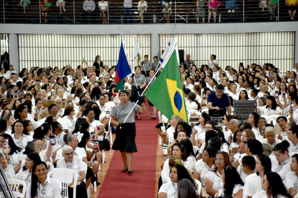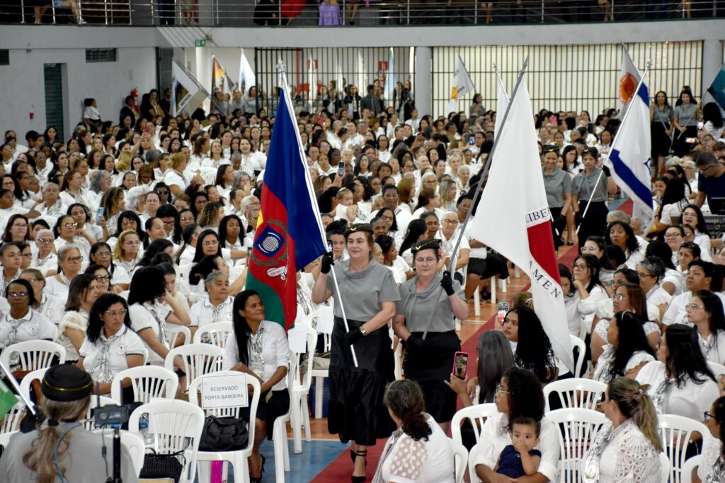 O momento cívico contou com a entrada das bandeiras nacionais, do município, da igreja e de Israel, seguidas pelas dirigentes dos círculos de oração das regionais.