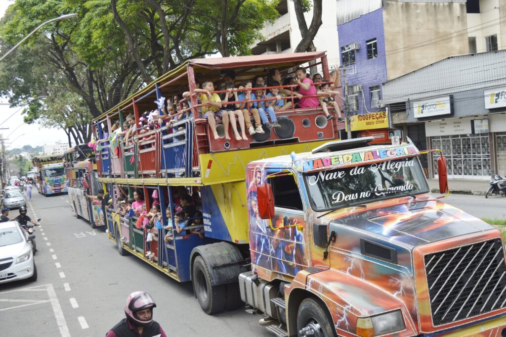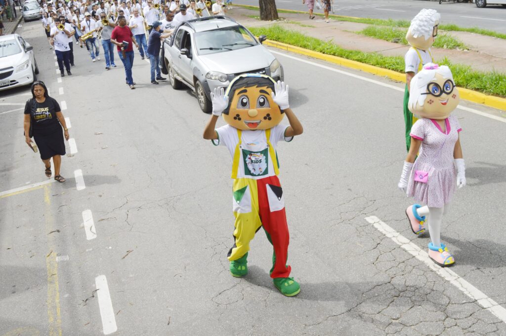 E crianças em um carro temático chamado “Trem da Alegria”, enriqueceram a marcha, trazendo cor e entusiasmo para as ruas.