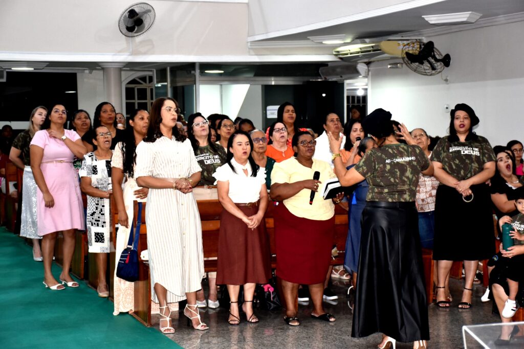 Domingo: a celebração final teve início com a condução da coordenadora Miriam Eufrásio, seguida pela oração do evangelista Antônio Luiz e a leitura oficial. O culto reuniu grupos convidados e momentos de grande edificação espiritual.