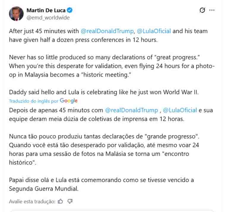 O advogado de Donald Trump, Martin De Luca, criticou, nesta segunda-feira (27), o encontro entre o presidente dos Estados Unidos e o presidente Lula (PT), realizado na Malásia. Ele afirmou que o governo brasileiro exagerou ao dizer que houve grande progresso na negociação entre os dois países.