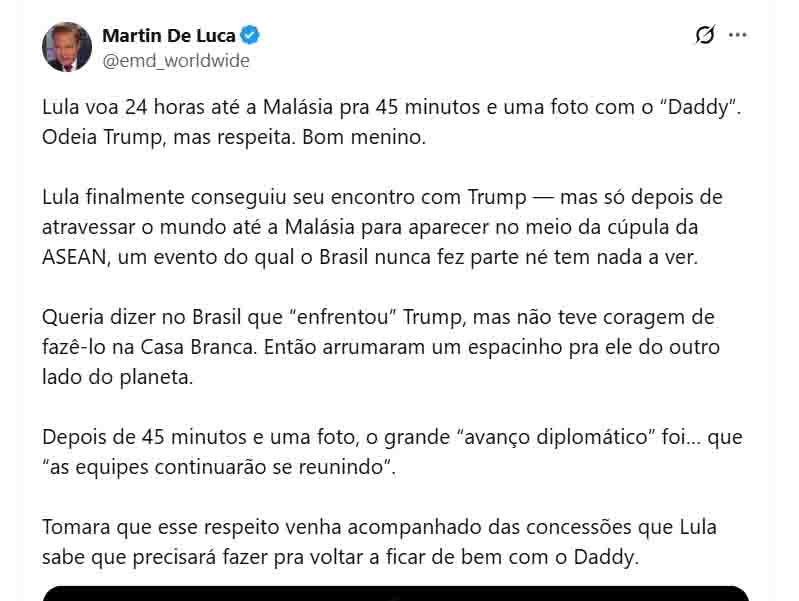 Nas redes sociais, De Luca disse que Lula viajou “24 horas para 45 minutos de conversa e uma foto”. O advogado ironizou o entusiasmo do petista ao comentar o encontro. Segundo ele, o Brasil nunca fez parte da Cúpula da Asean, onde a reunião ocorreu.