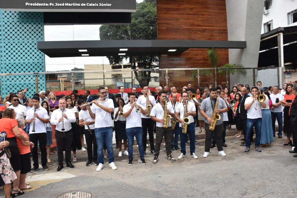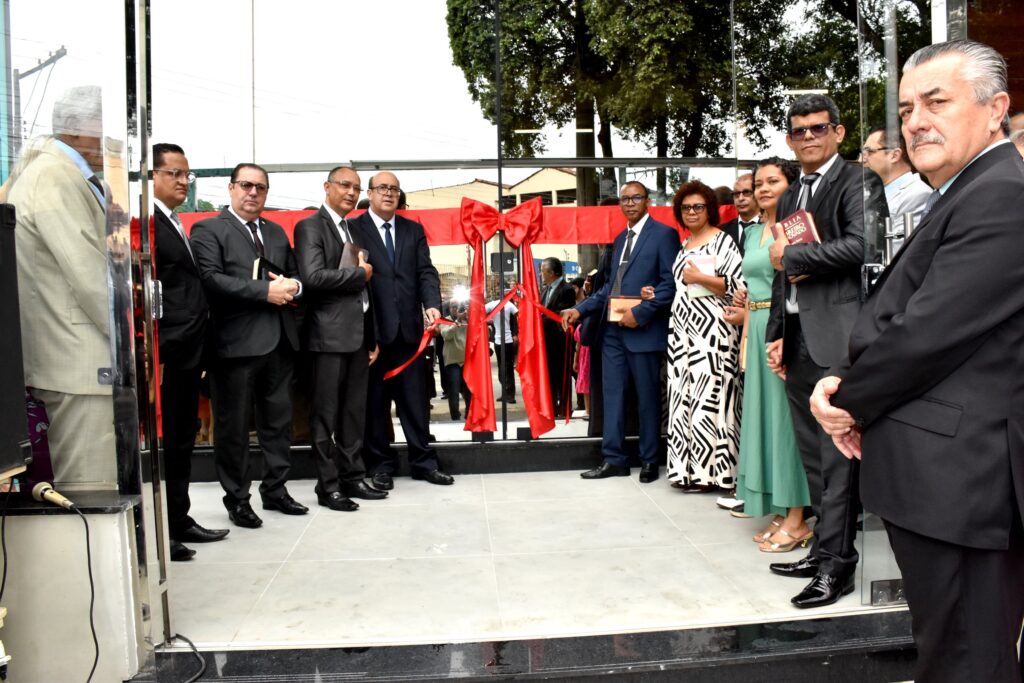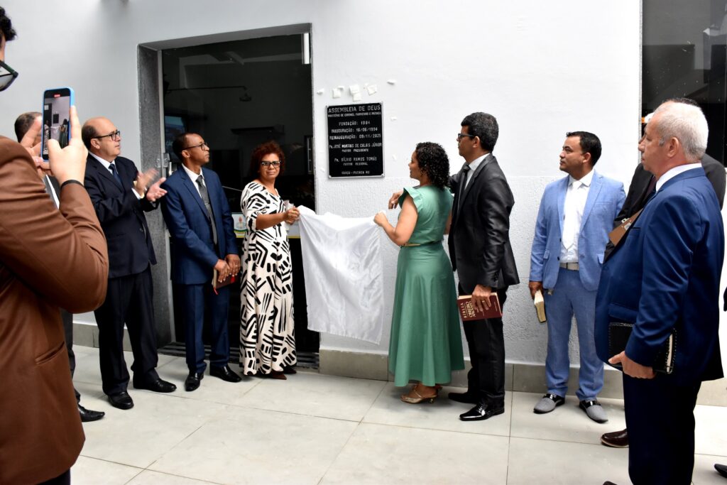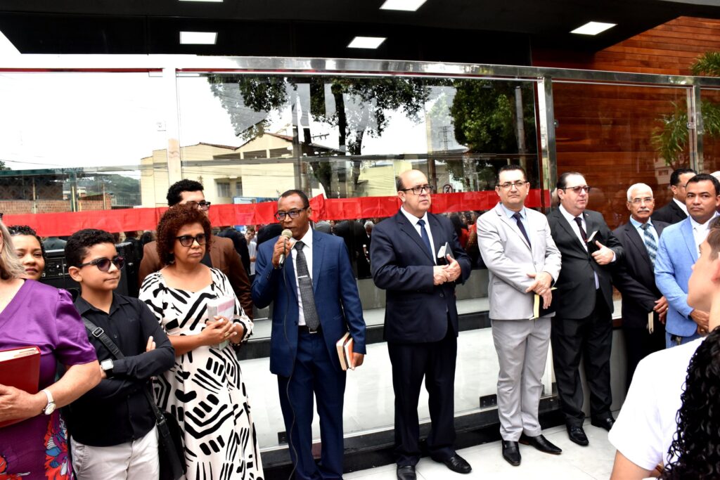 Em seguida, passou a direção do ato solene ao pastor presidente, Pr. José Martins de Calais Júnior, que assumiu a presidência da cerimônia e conduziu o descerramento da placa comemorativa e o corte da fita simbólica de abertura do templo.
