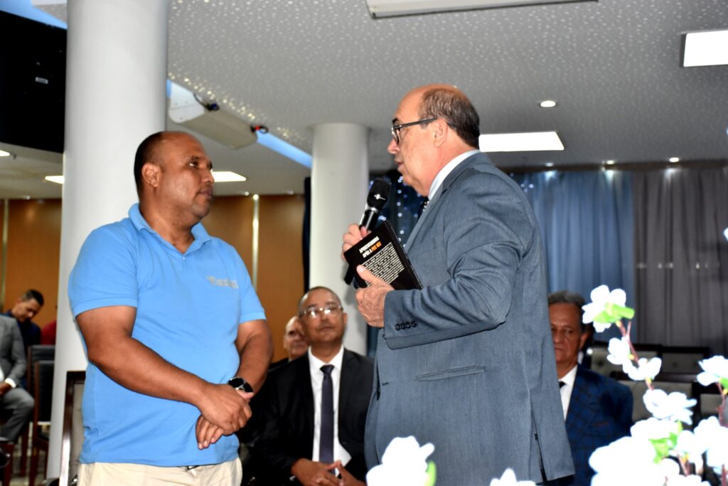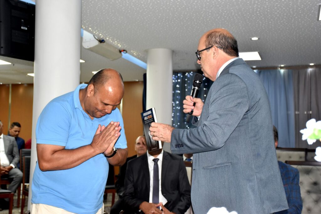 Em sua fala inicial, o pastor mencionou a participação do doutor Ázar. Ele destacou a obra literária escrita pelo advogado, voltada ao tema da aposentadoria, afirmando ter lido grande parte do livro e ressaltando a relevância do conteúdo. O pastor também enfatizou que a atuação profissional do doutor Ázar é dedicada à área previdenciária e que os recursos arrecadados com o livro são integralmente destinados à obra missionária.