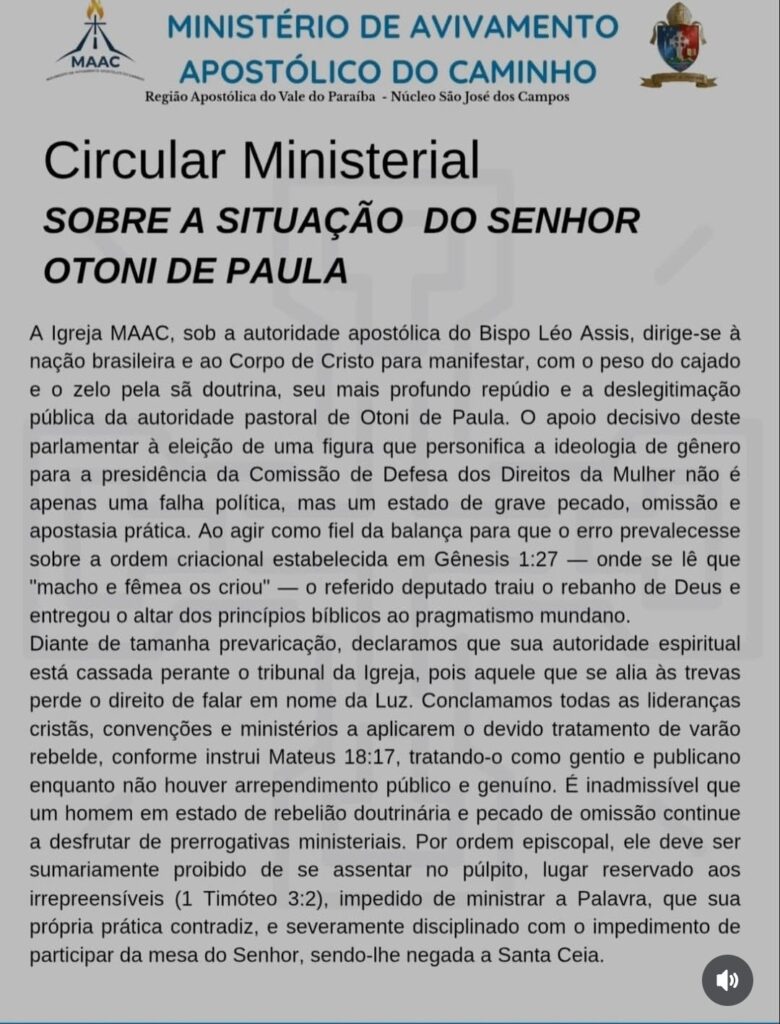A decisão do Ministério de Avivamento Apostólico do Caminho marca um ponto crítico na relação entre autoridade espiritual e atuação política, com possíveis desdobramentos tanto na carreira parlamentar quanto na influência religiosa de Otoni de Paula.